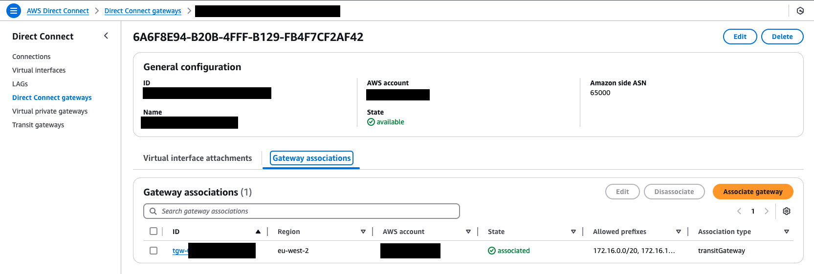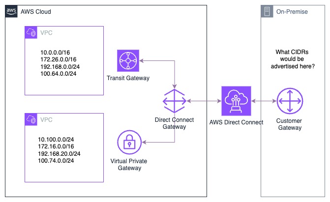 Firstly, this is just an example of a wider customer example! It wasn’t quite set up this way, but this is summarised to show the potential of two different ways to connect your network to AWS. In reality, the customer did have something similar setup, but connected to two different types of setup, that we came in to resolve for them. For this we shall look at the Allowed Prefixes list across both association types.