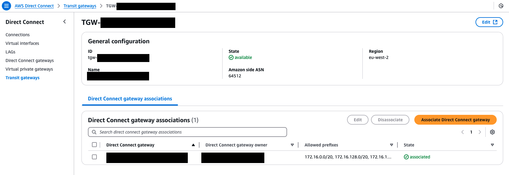 GOTCHA: Be careful when using the allowed prefix list with a Transit Gateway association, not to try and open up wider CIDR ranges than you need to, as this can have an unindented effect on the traffic that is advertised into the Transit Gateway and on premise.