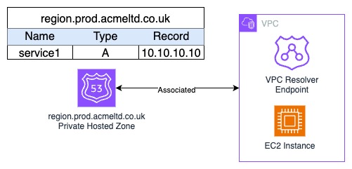 service1.acmeltd.co.uk -> CNAME -> service1.region.prod.acmeltd.co.uk -> Private Hosted Zone -> 10.10.10.10